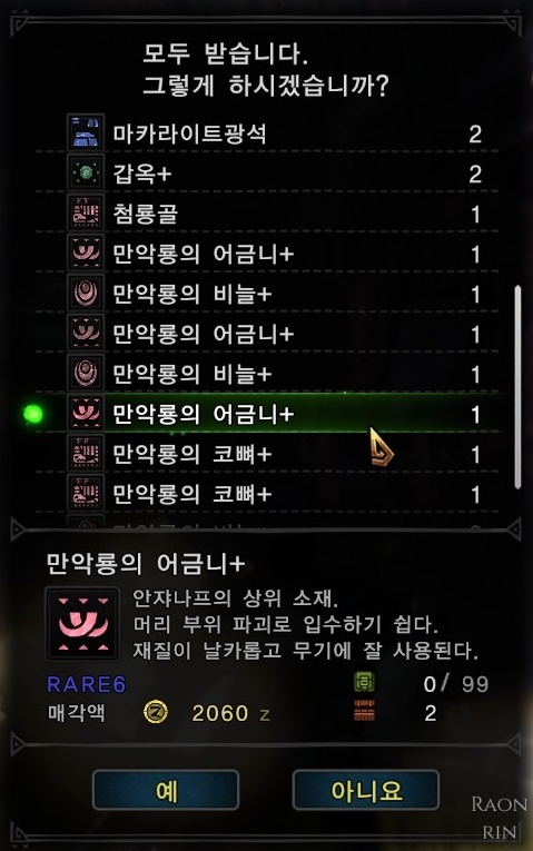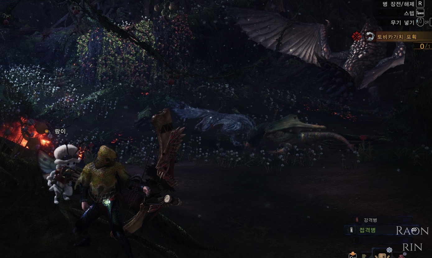 Now I need Gleaming Streamstone, so I decided to make a fire element bow before going to hunt Kirin. Way back when I first played Monster Hunter on PlayStation, Anjanath gave me a really hard time and I kept carting. Even after switching to PC, it wasn’t easy – I did the assigned quest once and never hunted it again. But I had no choice since I needed a fire bow. Turns out with better weapons, it’s such a pushover… Just repeatedly use power shot → arc shot → power shot → arc shot → power shot → arc shot at its head and it goes down easily.